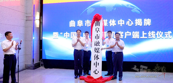 孙爱民和刘东波共同为市融媒体中心揭牌,启动开通中国曲阜APP移动客户端上线。