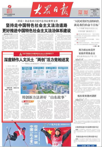 山东省2022年工作动员大会强调,要重点抓好“十大创新”,2月16日出版的《大众日报》头版刊发了《深度耕作人文沃土 “两创”活力竞相迸发》的文章,聚焦山东“加强文化宣传创新”的经验做法。