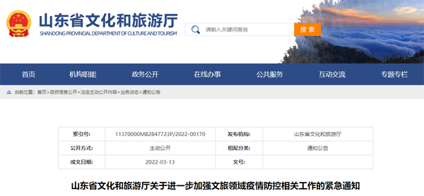 3月13日山东省文化和旅游厅发布关于进一步加强文旅领域疫情防控相关工作的紧急通知↓↓↓各市文化和旅游局、厅直属各单位: 根据近日疫情发展变化情况,为进一步筑牢全省文旅领域疫情防控“隔离墙”,现就相关工作通知如下: 一、暂停线下培训活动。自即日起,暂停全省各级各类公共文化服务场馆组织的线下培训活动,包括各类公益培训及出租出借场地进行的文化艺术类培训。 二、加强带团导游健康监测。自即日起,导游带团时须持48小时内核酸检测报告。旅行社、导游服务机构要监督落实,各级文化和旅游执法机构要加强执法检查。 待全省无中、高风险地区后,自行恢复正常培训和带团旅游。山东省文化和旅游厅2022年3月13日