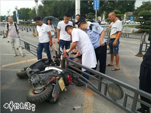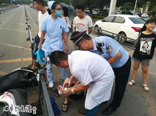 8月8日下午,曲阜市公安局高铁新区派出所民警在巡逻过程中发现出租车通道有人群聚集。经上前了解得知,一男孩骑摩托车与出租车发生碰撞后摔倒,致使该男孩脚部受伤流血不止,现场该男孩脸色苍白,表情十分痛苦。